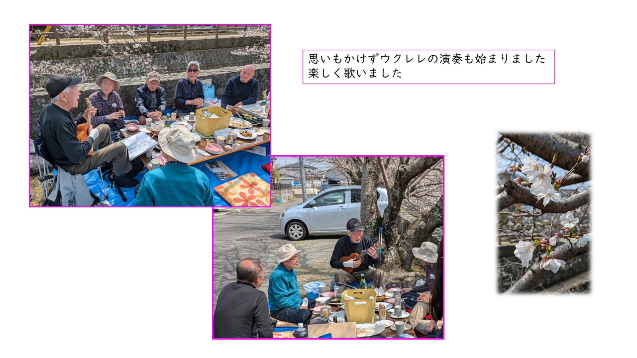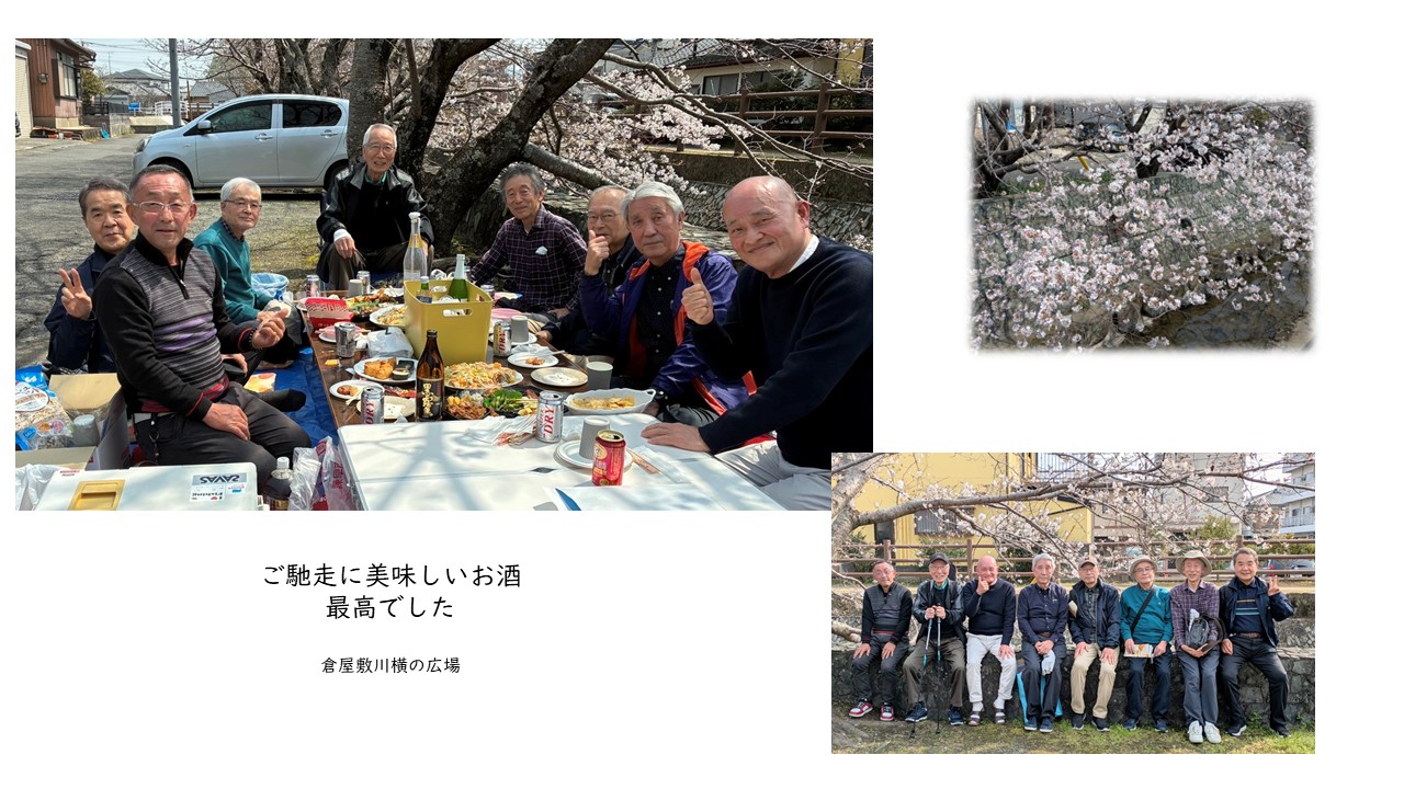 3月28日有志による花見を実施しました。場所は倉屋敷川横の広場です。桜は咲き初めでしたが思った以上に咲いていて温かい日差しのもと楽しいひと時を過ごしました。